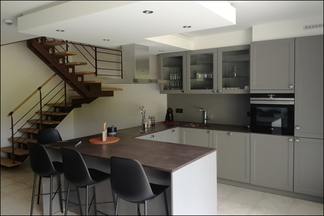 • Cuisine équipée ouverte avec coin bar et 4 chaises hautes : Taque de cuisson à induction 4 foyers et hotte. Four, micro-onde, frigo avec compartiment de congélation et lave-vaisselle. Grille-pains et bouilloire électrique. Machine à café Dolce Gusto et percolateur.